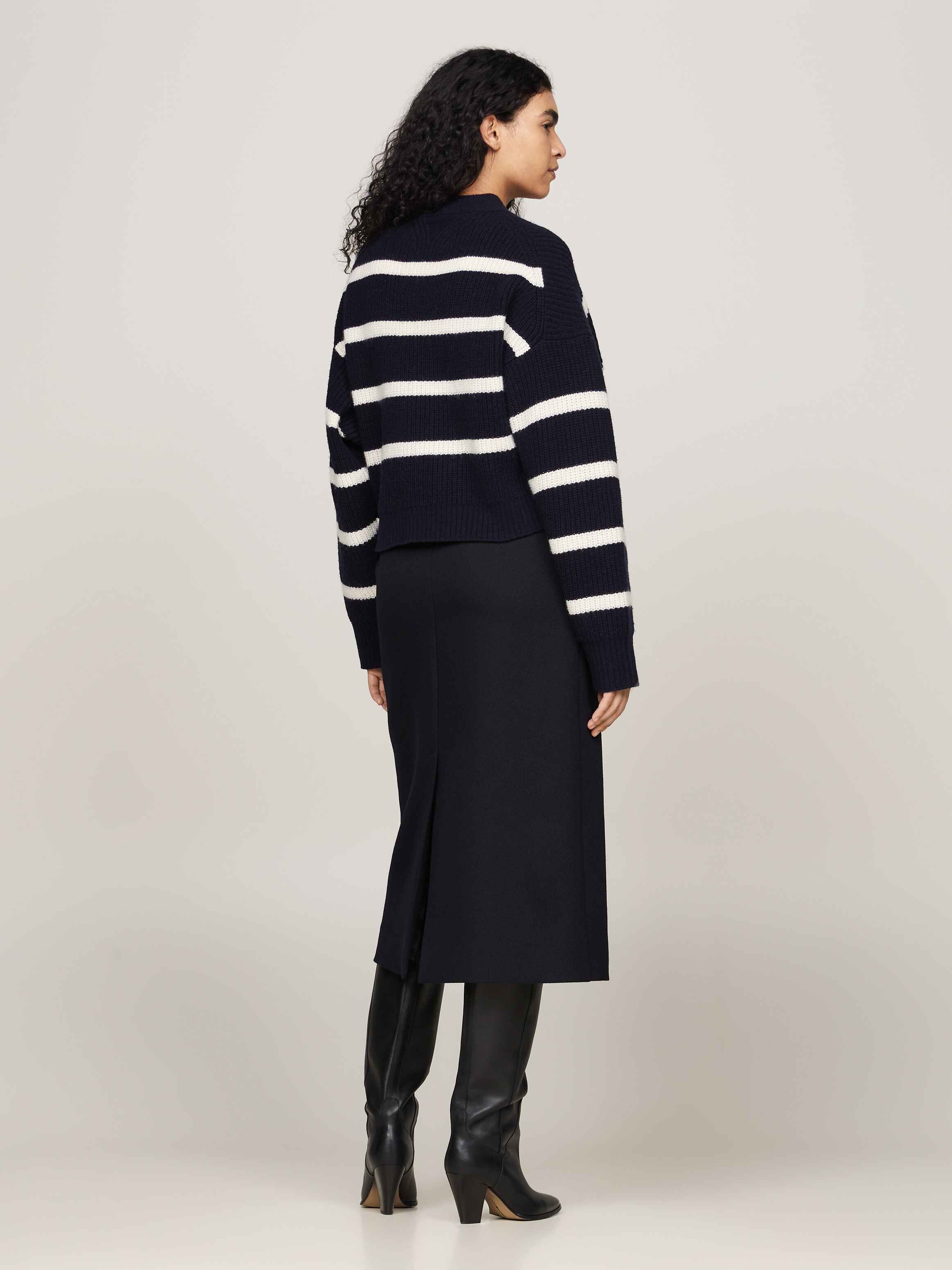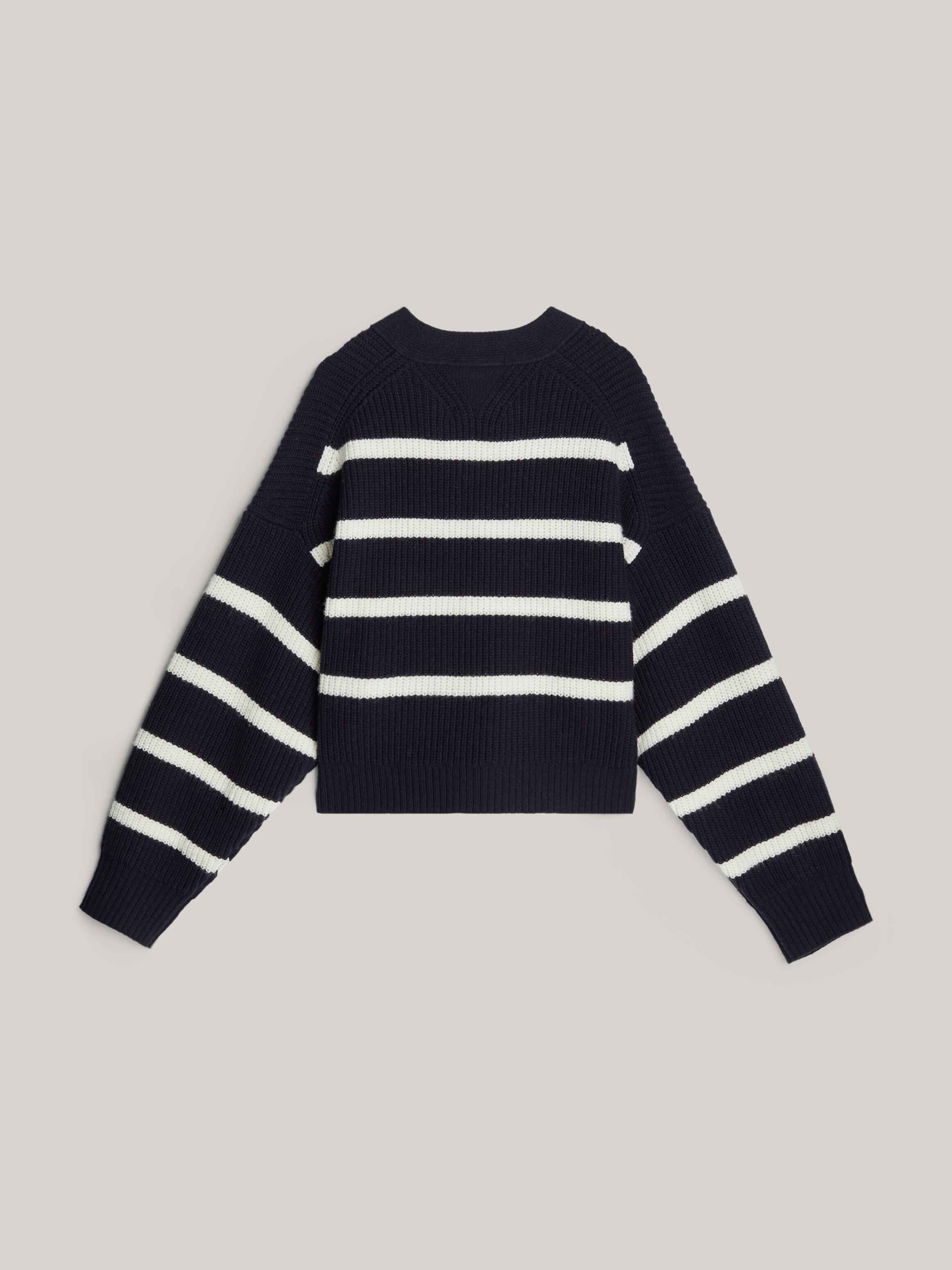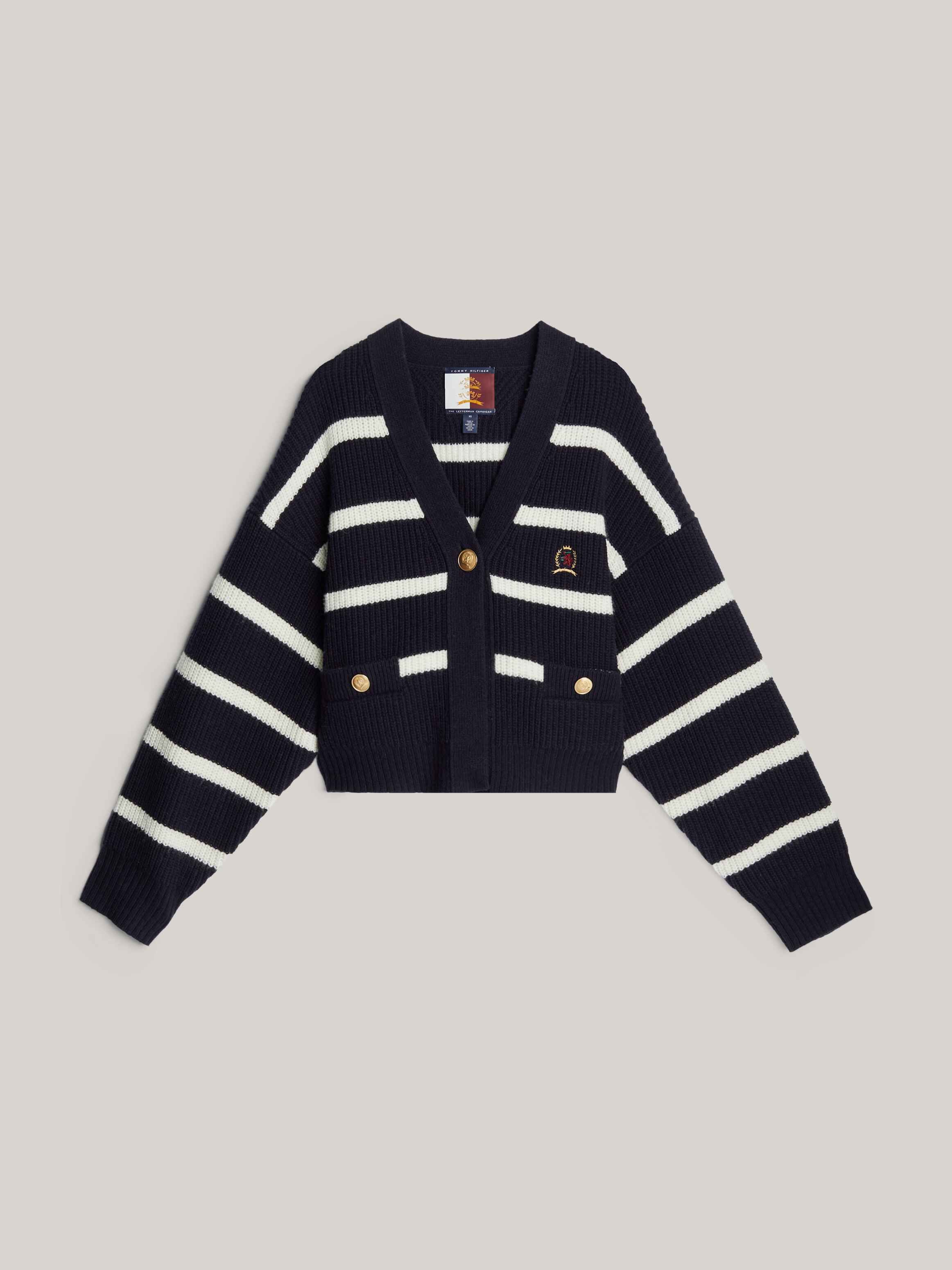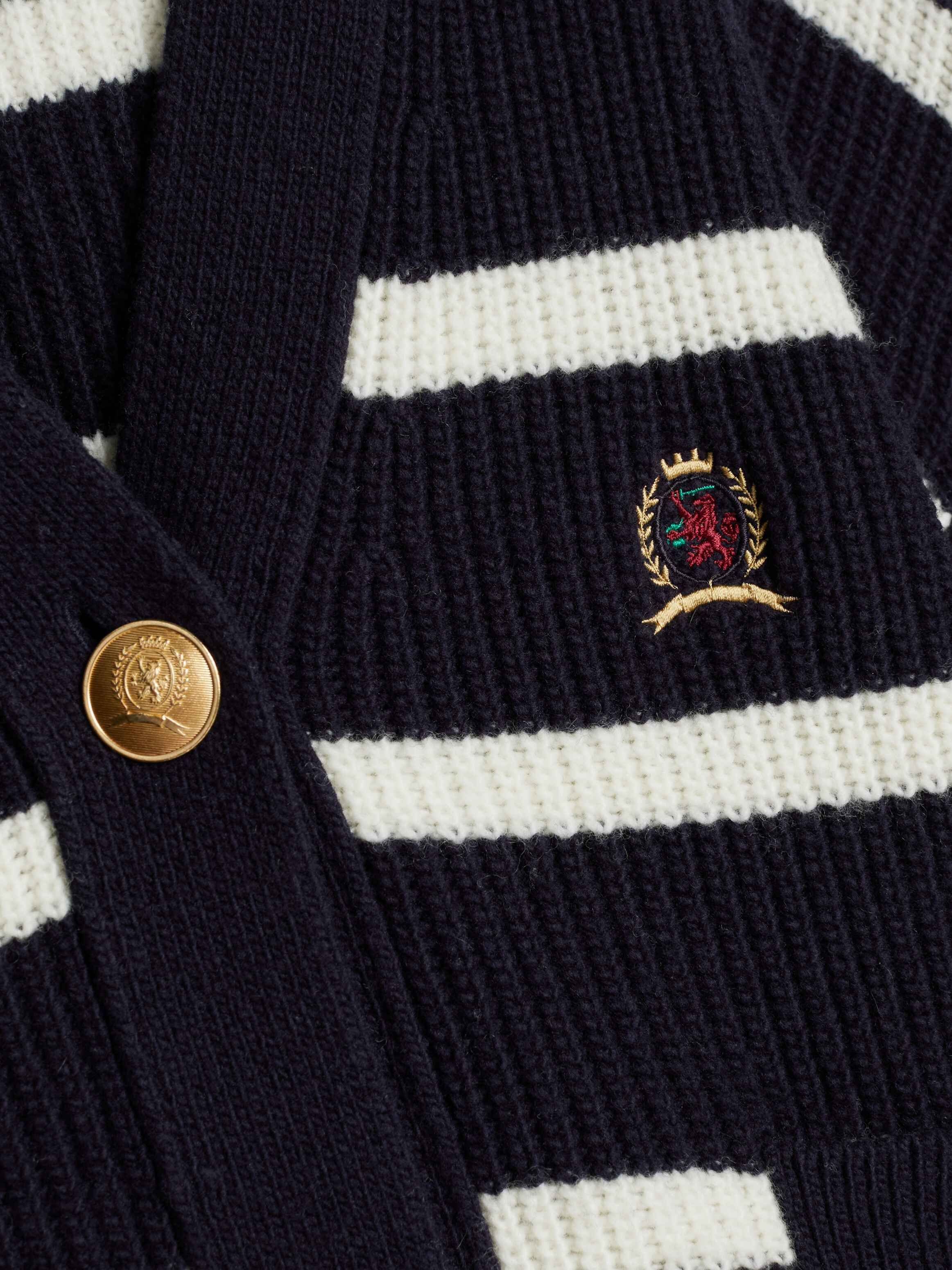 • Pure wool • Chunky knit • All-over Breton stripe • V-neck • Rib-knit cuffs and hem • Two front buttoned pockets • THC crest embroidery on chest • TH Collection branding