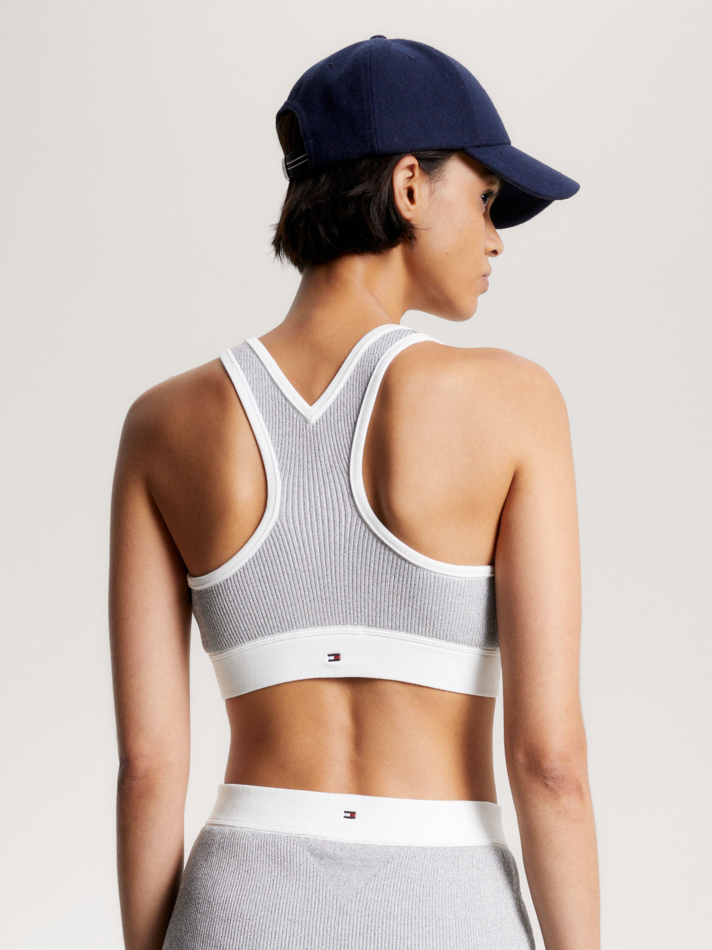 Metallic fibres in the recycled rib knit add a touch of sparkle to this pull-on sports bra with cool racerback styling.
