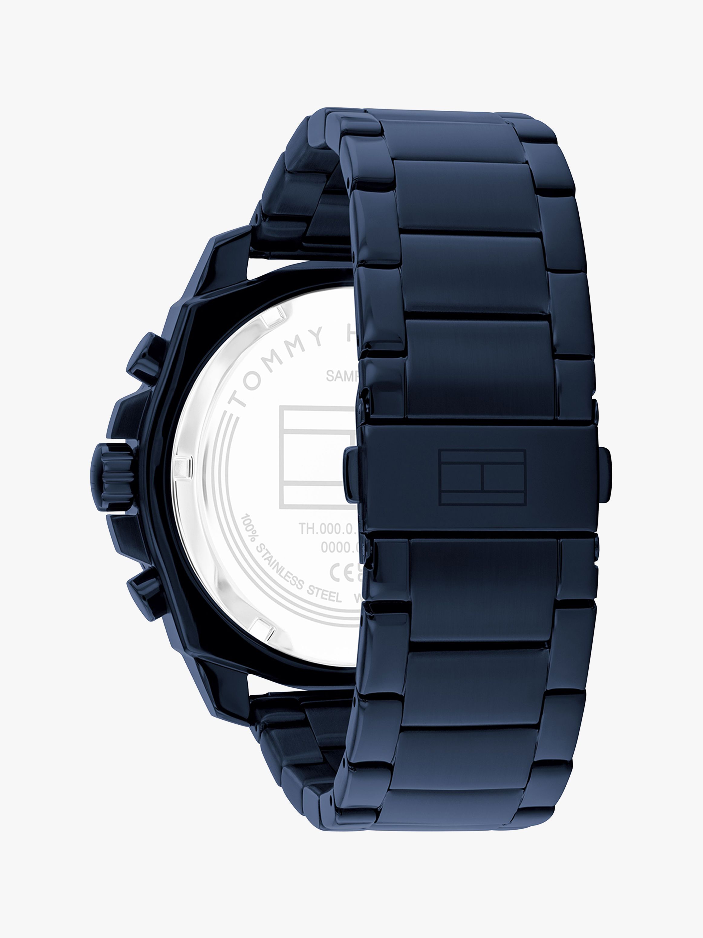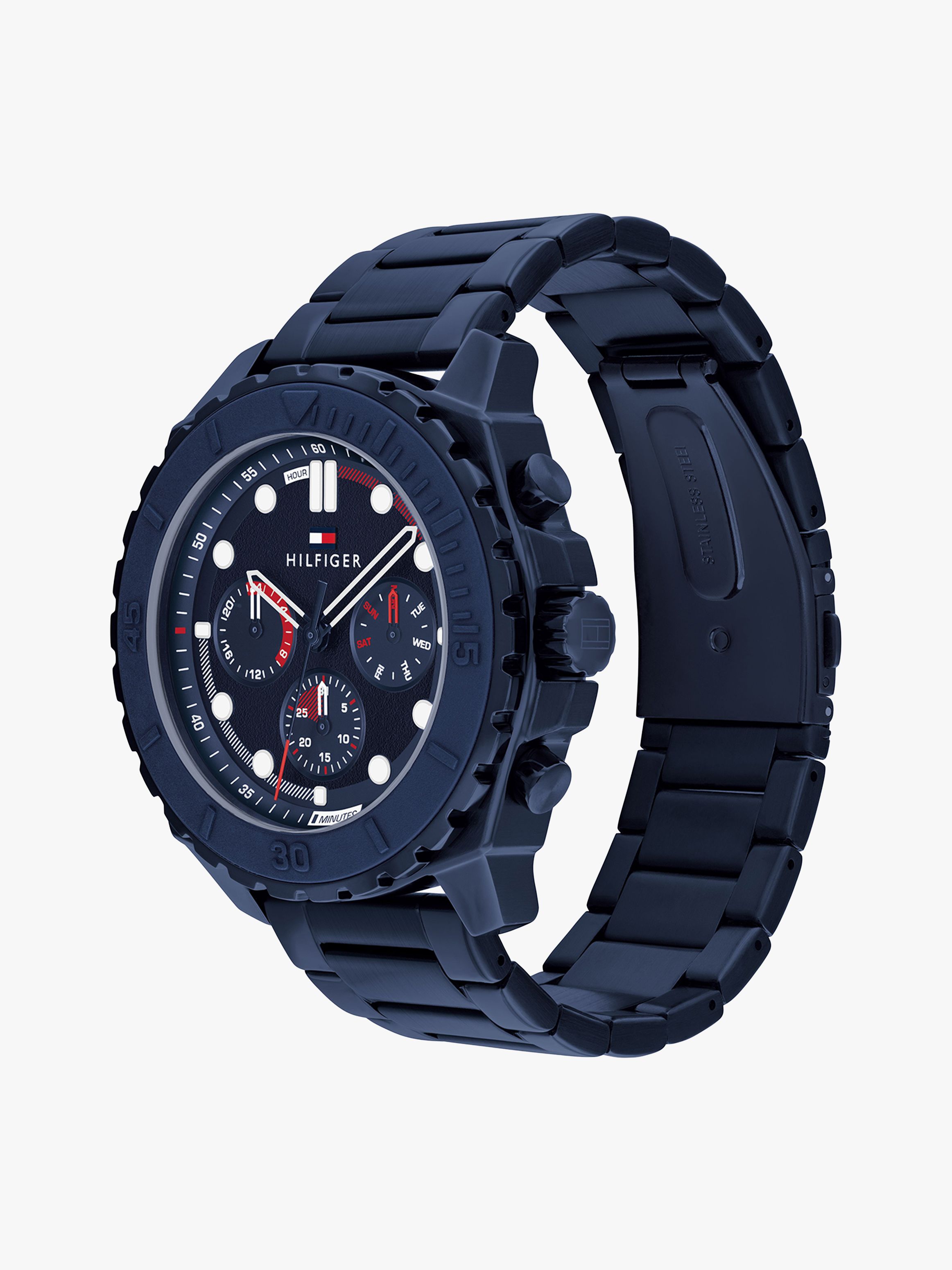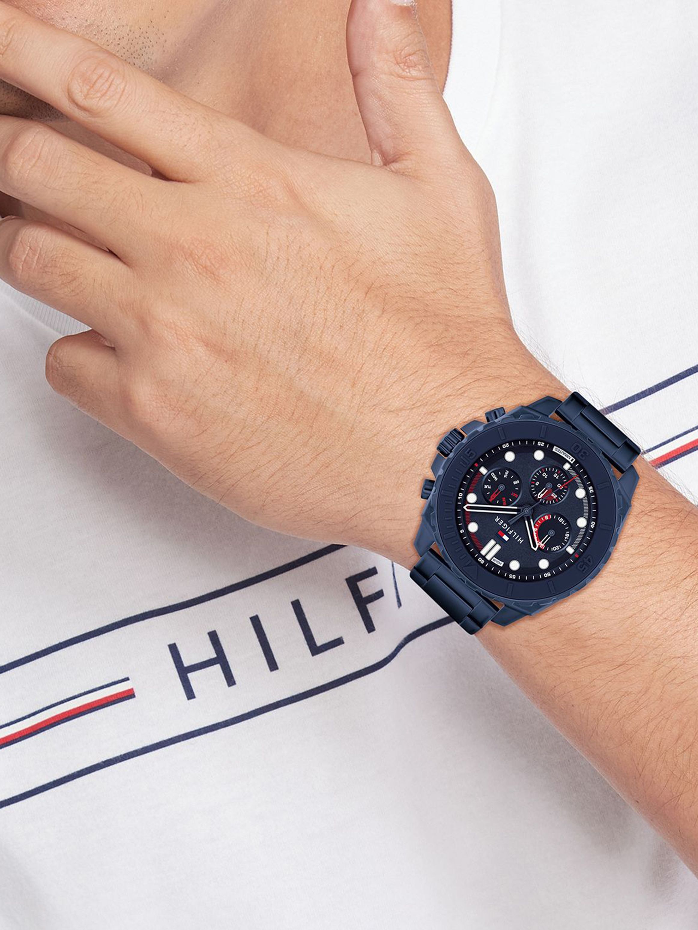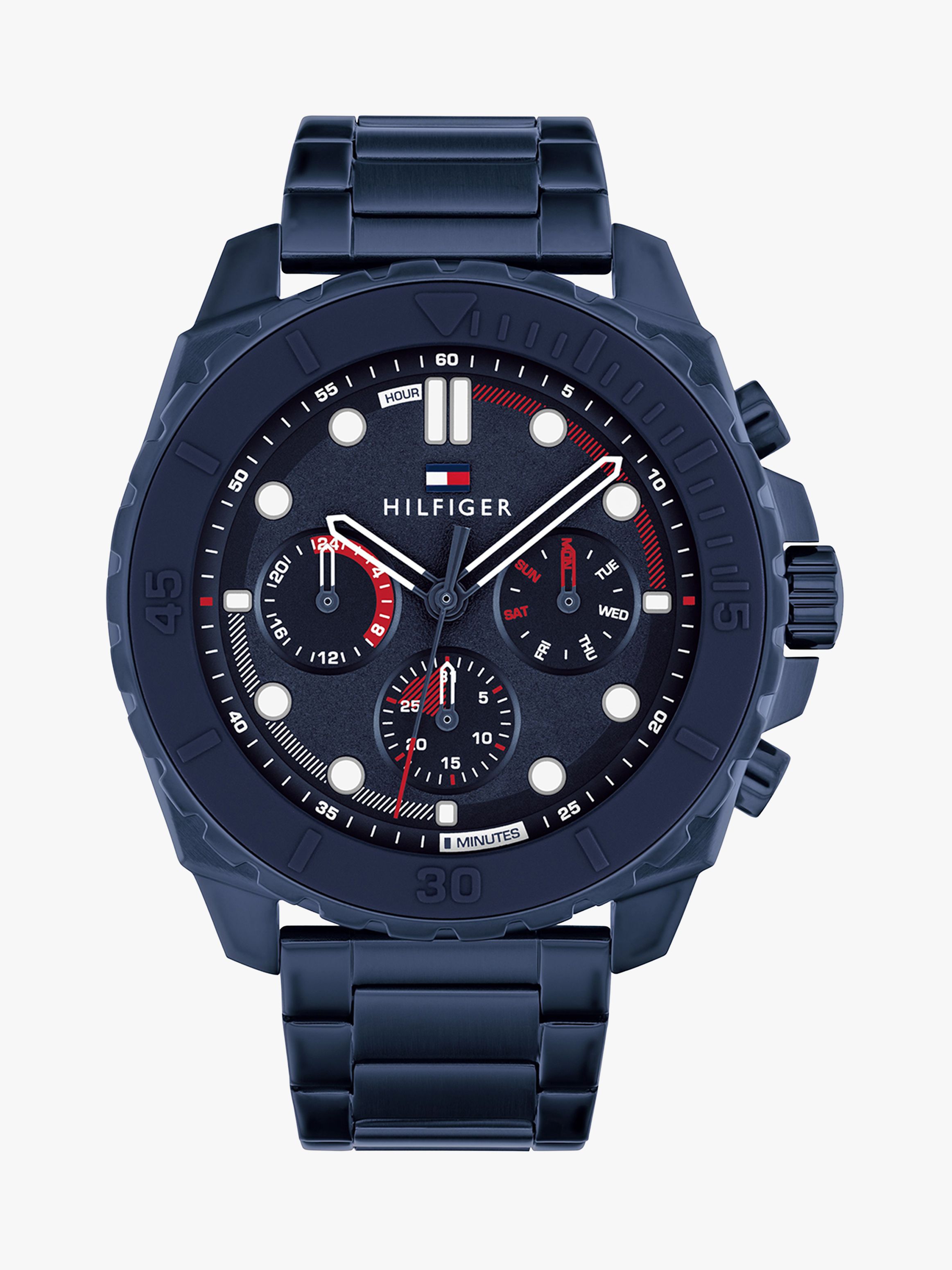 The new Tommy Hilfiger men’s watch is the ultimate weekend explorer—oversized, rugged, and ready for adventure. Featuring link bracelets, a bold sport silicone bezel, and a supersized case, it boasts a light matte grain dial with bold round and stick indexes, plus pops of color for added flair.
