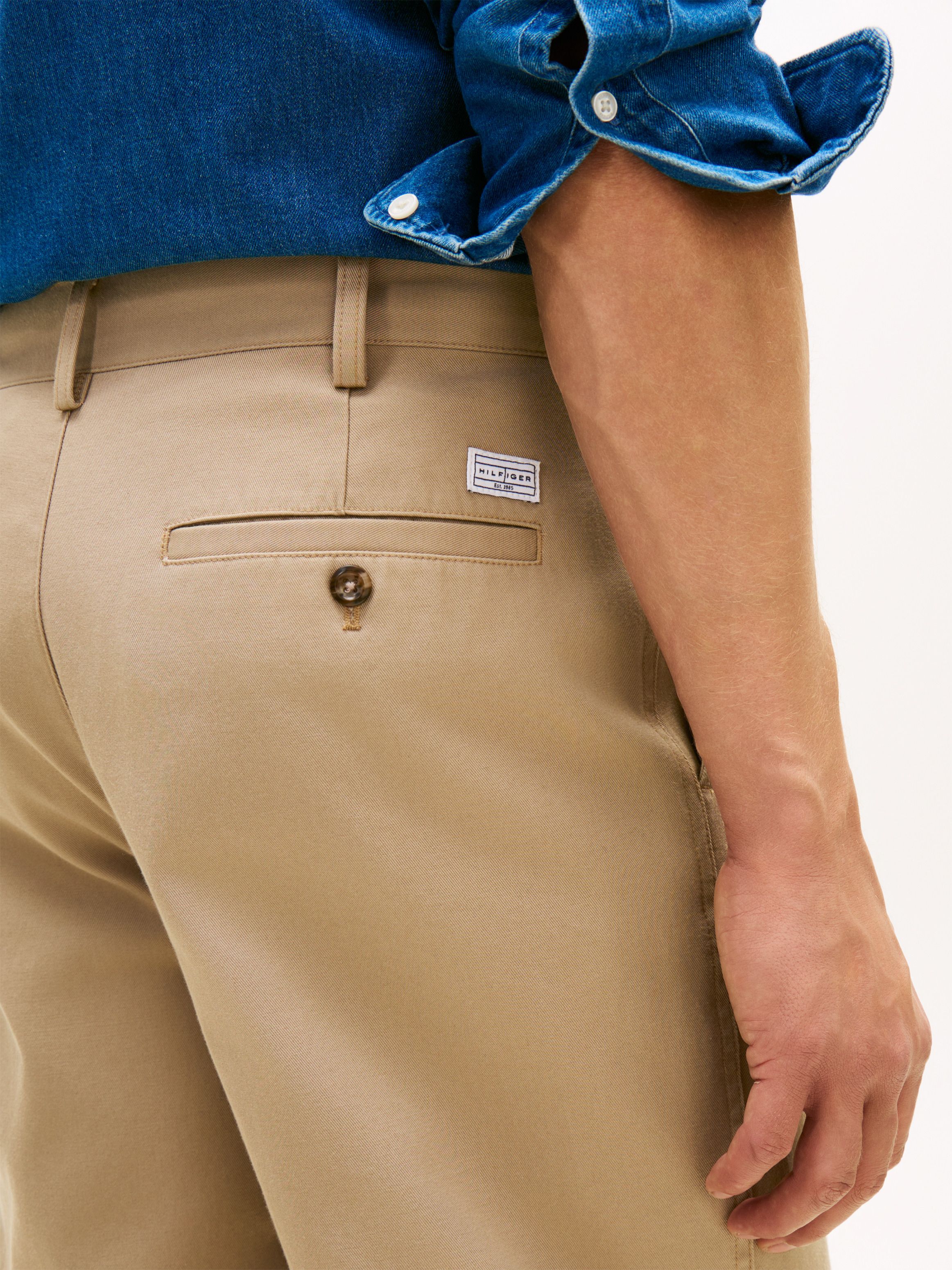 • Pure cotton twill • Zip with button closure • Two side angled slip pockets • Two back buttoned welt pockets • Signature tape on hip • Tommy Hilfiger logo label on back • Tommy Hilfiger branding