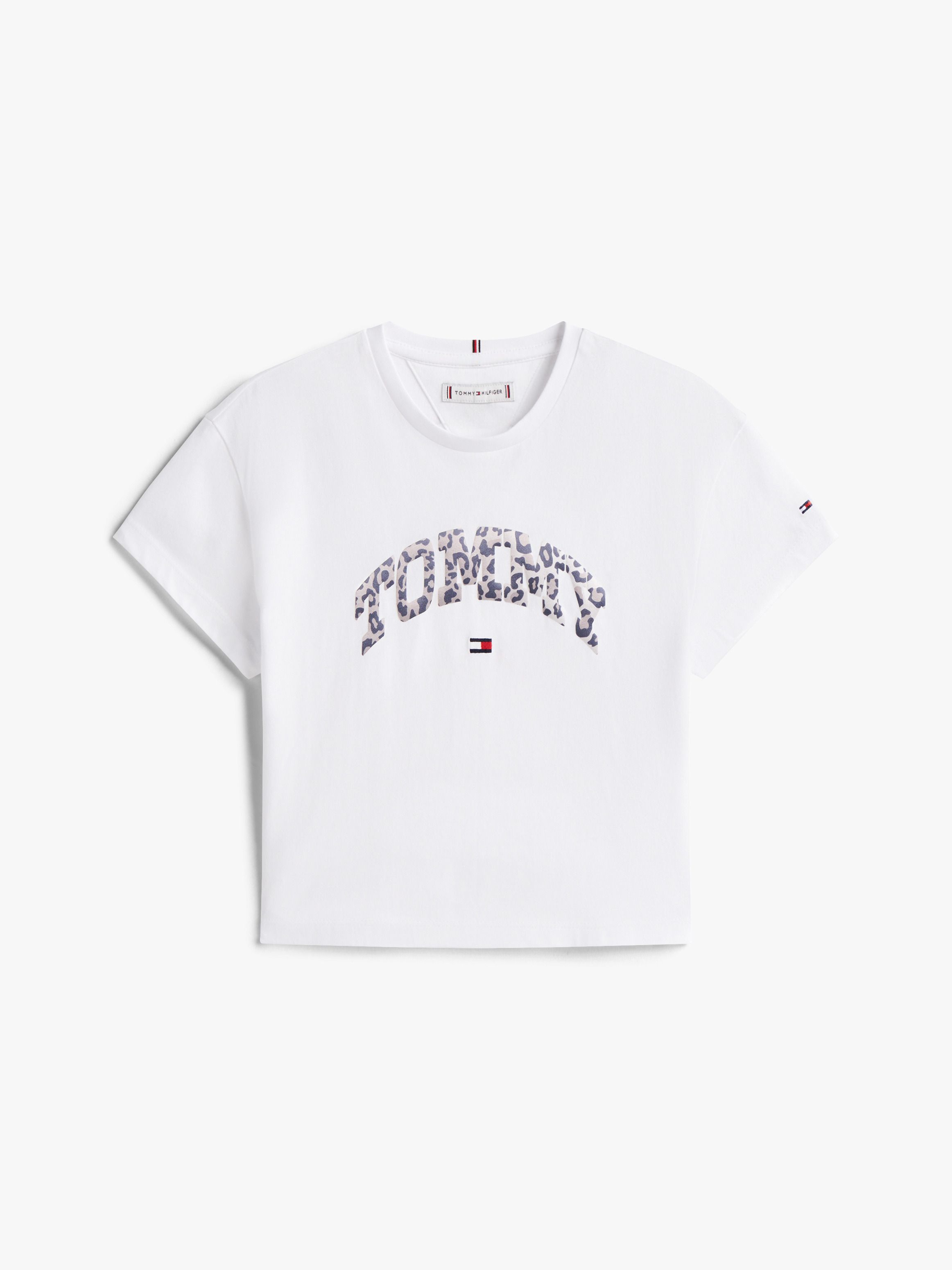 • Pure cotton jersey • Crew neck • Signature tape on nape • Tommy Hilfiger leopard print sateen logo on front • Tommy Hilfiger branding • Tommy Hilfiger flag embroidery on sleeve